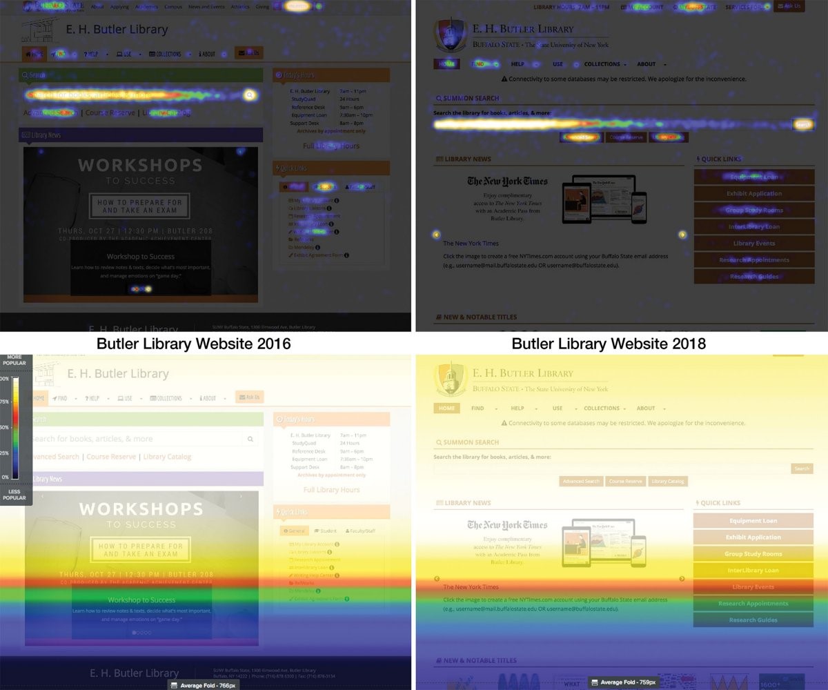 When setting up a heatmap, Crazy Egg provides a number of options for each snapshot. Since library websites are most likely responsive, the interfaces and experiences of both are very different. Thus, it’s important to create individual snapshots for desktop, mobile, and tablet views—ensuring that we get an accurate visualization of user behavior. The visualizations generated by tools such as Crazy Egg are compelling representations of user data that usually speak for themselves. People are al ways shocked, amazed, and interested in viewing the visualizations. Use these visualizations to drive user-informed decisions to create the most user-friendly websites possible. The ability to compare how people use the library website at different points of the academic calendar—summer, fall, and spring—reveals that our users have different needs at different times.