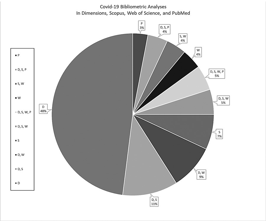 Although the web resources pull together a lot of information about the state of COVID-19 research worldwide, quite a bit more information exists in traditional PRJAs (peer- reviewed journal articles) and related publications. To get a rough sketch of the quantity and nature of published bibliometric analyses related to the corpus of COVID-19 re search, I did some very simple searches in PubMed, WoS, Dimensions (free version), and Scopus. This exercise also gives some clues as to the coverage of these topics in the known citation databases.