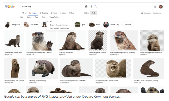 There are numerous Creative Commons sources available throughout the web. A great one is Pixabay, an extensive archive of free images that can be easily searched and shared. While most of these images are attractive photographs, search results often do include images with transparent backgrounds. Google is another option. Performing an image search will return a vast number of results that will need to be filtered down. After selecting Image, click Tools beneath the search box, then choose Creative Commons licenses from the drop-down option Usage Rights. This will ensure that the results you see are available to you for free without requiring expressed permission by the creator.