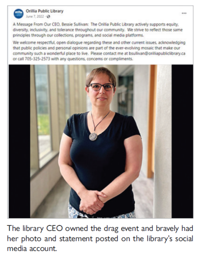 In 2019, when I was CEO of Haliburton County Public Library (a geographically large county in Ontario, Canada, with a relatively small population of 20,000), we hosted a drag queen storytime during Minden Pride Week. We had very little pushback from the community, and it was a universally loved event. Now, I am the CEO of Orillia Public Library (a small city in Ontario with a population of 32,000), which had previously held a drag queen storytime in 2018. There had been some community grumbling, but nothing extraordinary. Fast-forward to Pride Month in June 2022, when the situation was quite different.